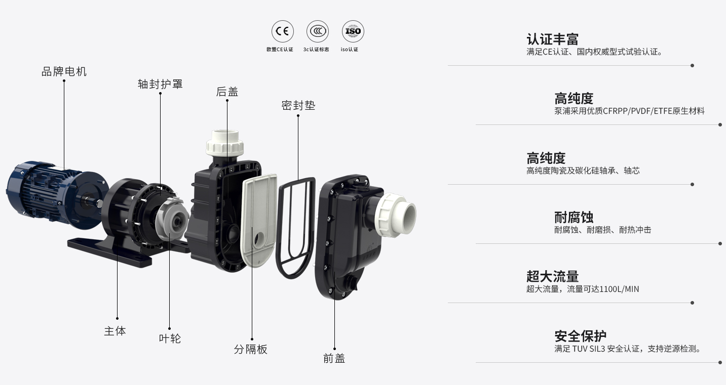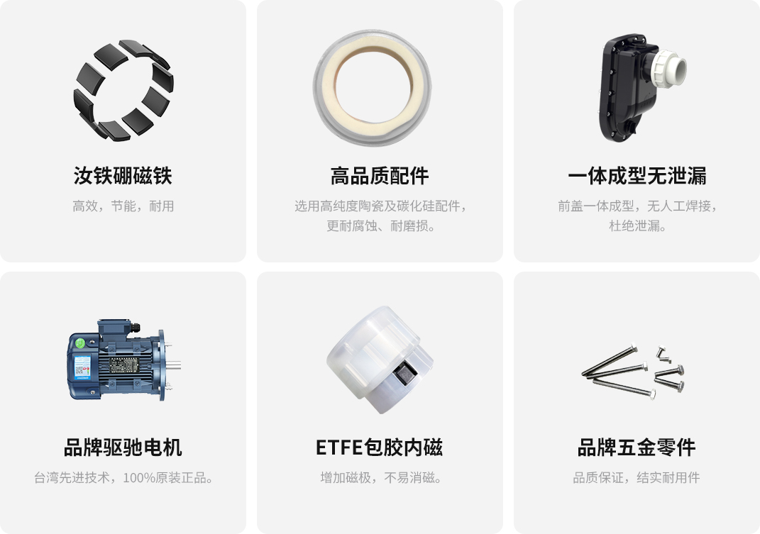 主體與葉輪獨立設計,拆裝便捷; 泵浦采用優質原生PP/PVDF, 提升耐腐蝕能力及結構強度; 內置自冷式防空轉系統,